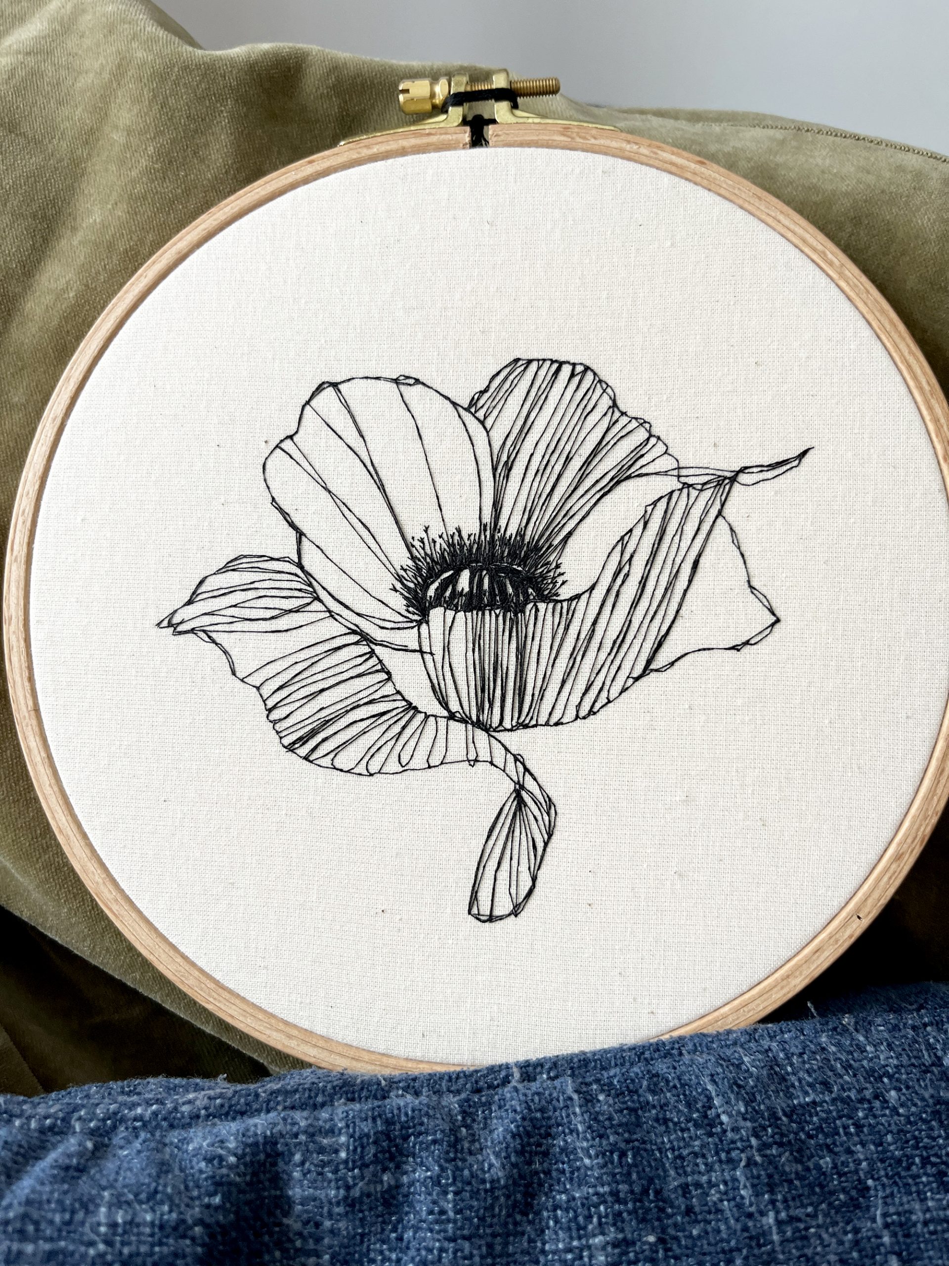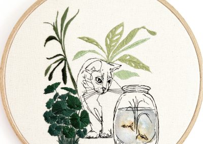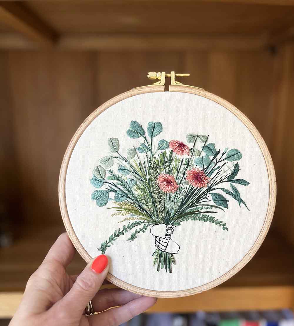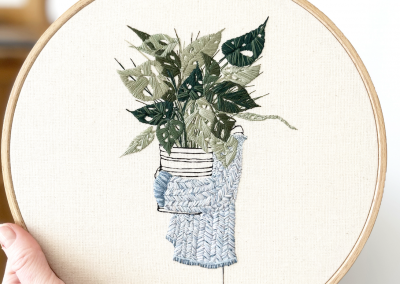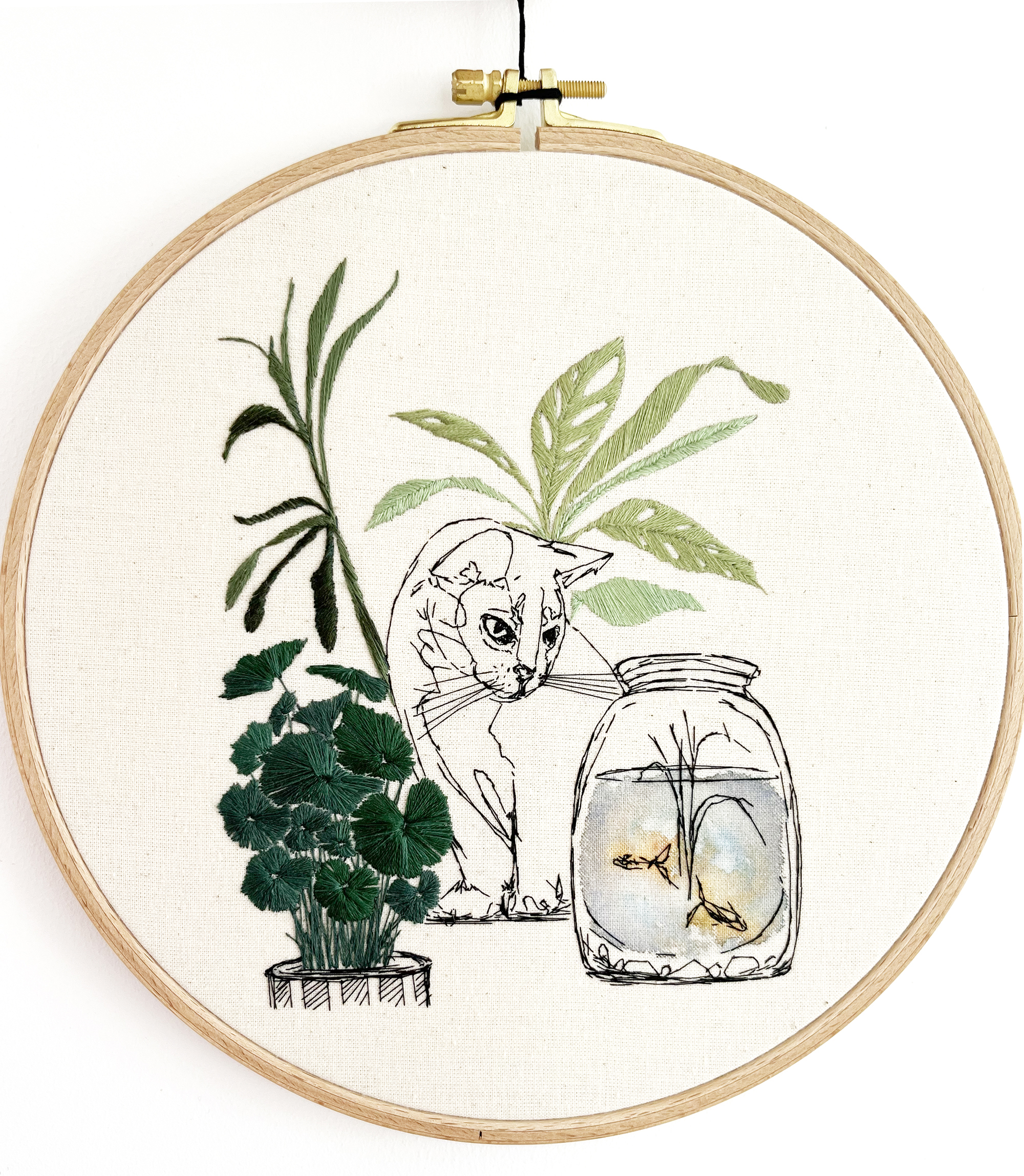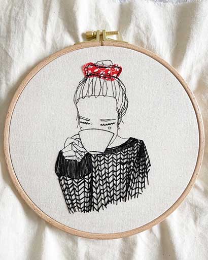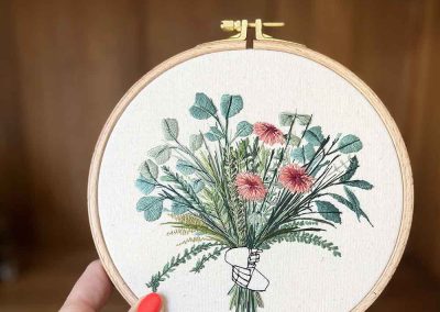 Her work often features calm, gentle imagery — flowers, plants, people in soft, relaxed poses — intended to evoke a feeling of comfort and quiet. Pieces are presented either framed in their original embroidery hoop, on canvas, or as prints, depending on what suits the subject best.