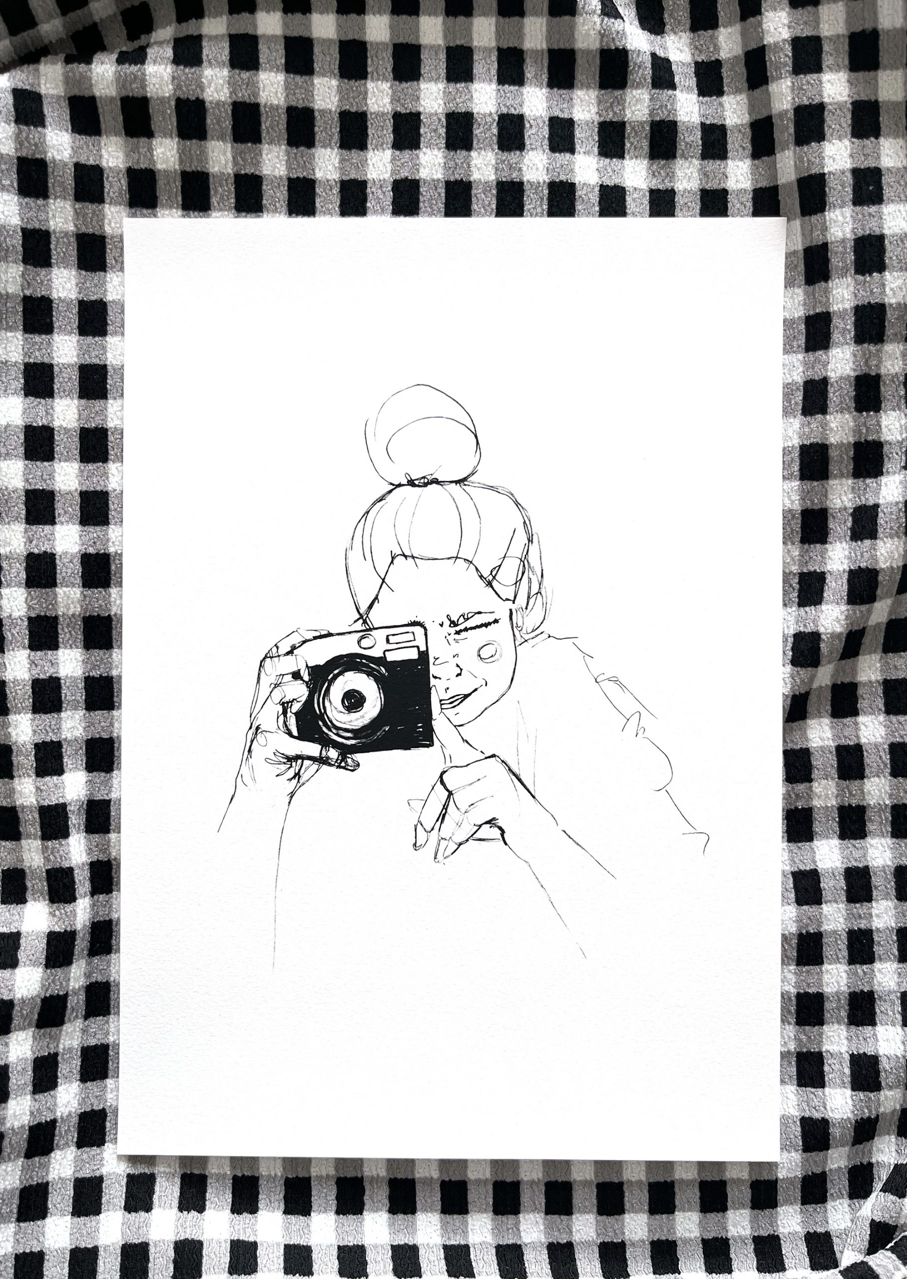Her process begins with pen-and-pencil sketches from reference photographs. These are then transferred onto calico and stitched by hand, using thread like a pen to preserve the honest, expressive line. Her print works are lightly digitally enhanced to stay true to the original drawing.